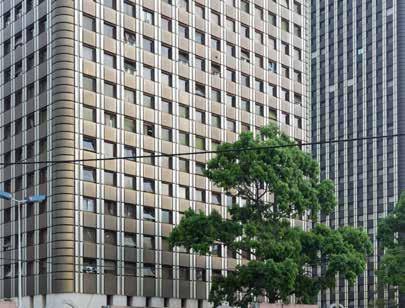 As built, the sheer façade has become populated by a spread of air-conditioning units that stand in place of the deep extended floor plates that were intended to shade the bands of glazing, and to allow for natural ventilation across the building’s shallow plan. However, in its current state, the building’s main long elevation attains an unusual degree of simplicity, played against the edited classicism of its entry porticoes.
