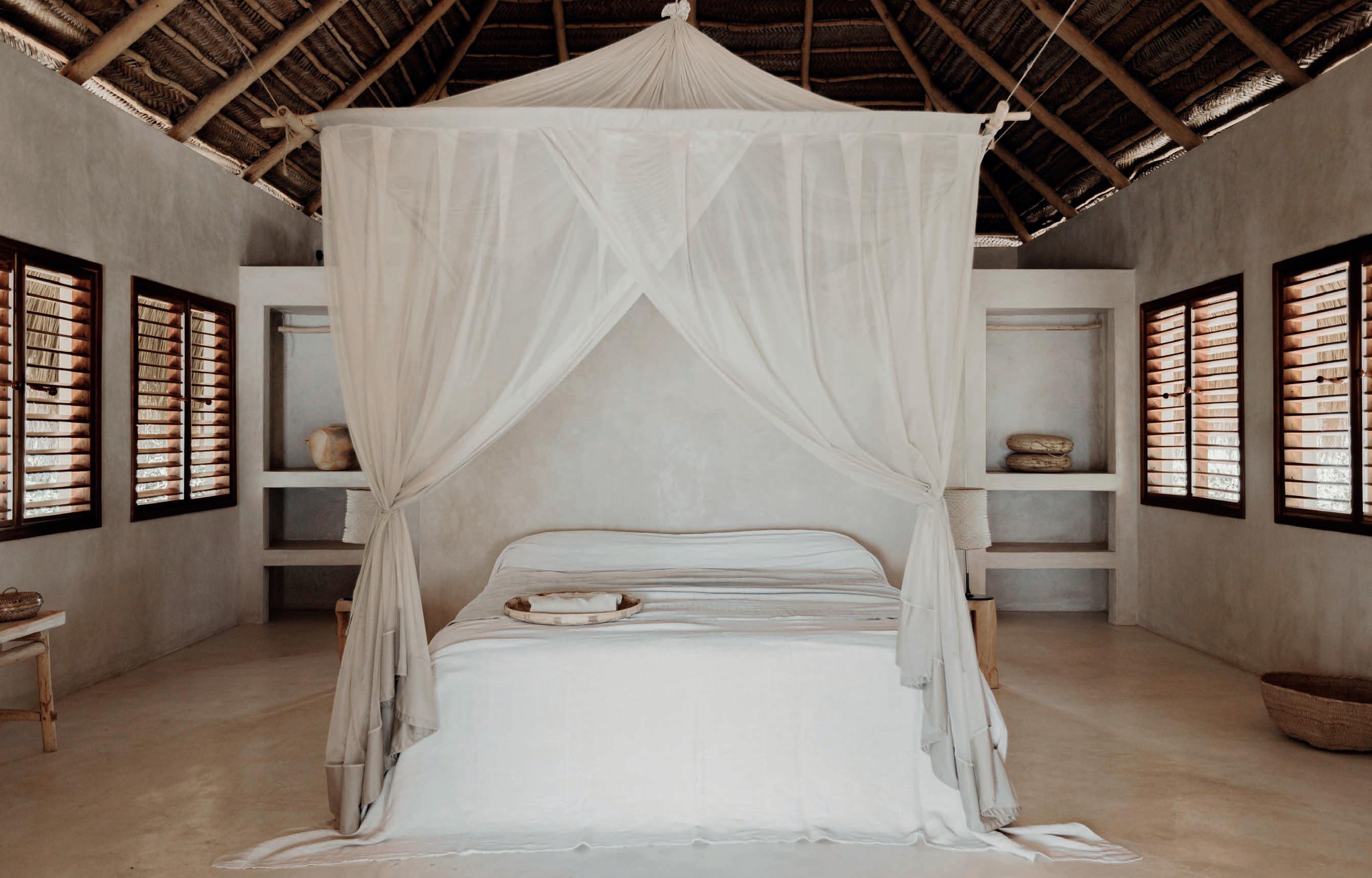 Mozambican vernacular architecture weaves a natural canopy above billowing mosquito nets. Large apertures allow the colours of an ever changing landscape to permeate the space.