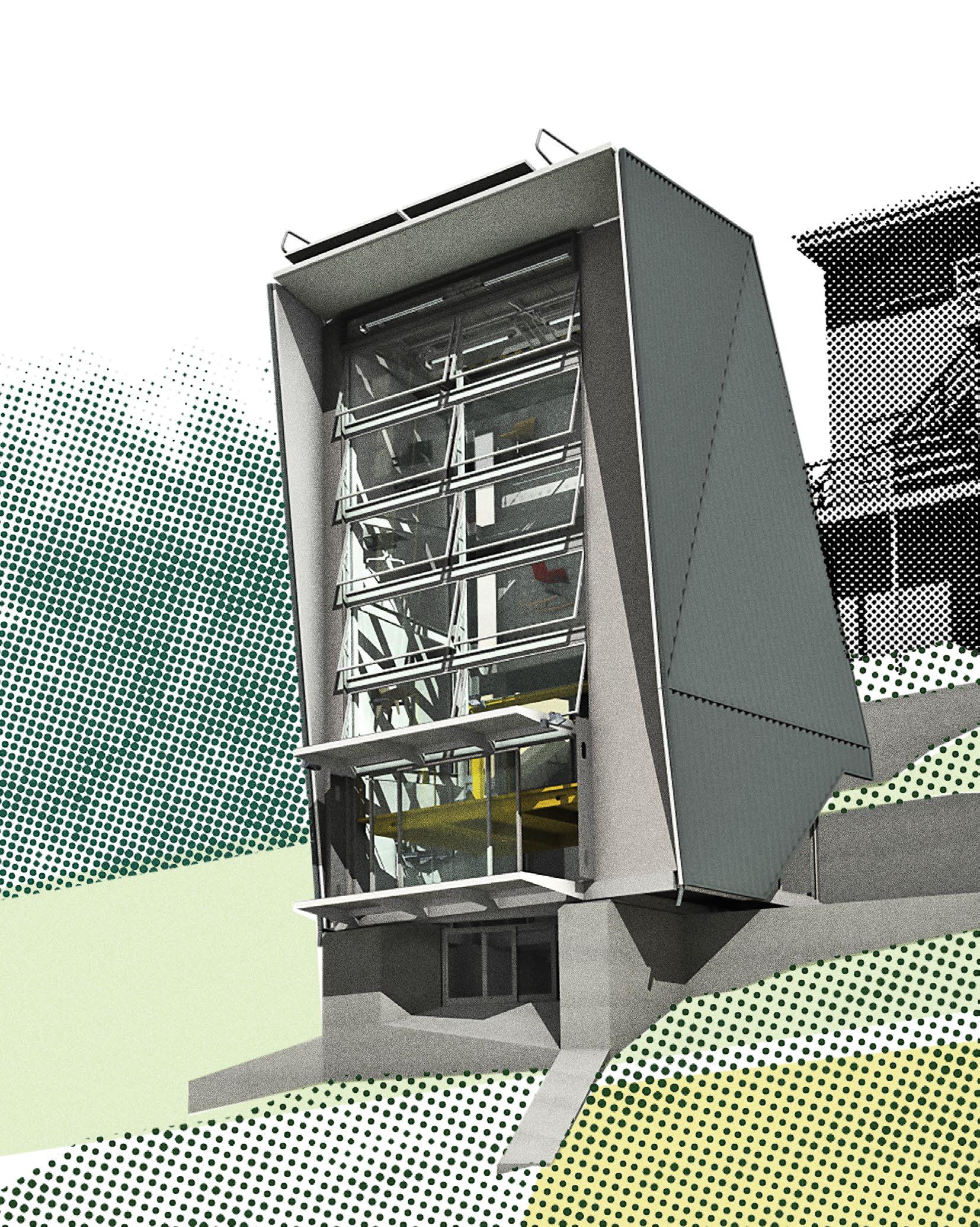 recognized that the structural properties would not be compromised in applications that respected the essential working-orientation of the steel bents, and so proposed a design based on the slightest variations of the bents themselves—tilting gestalt to the cladding—set off by the classic glazing-as-void move, in order to produce a restrained yet distinctive geometry that in no way recalls the clichéd inexpensiveness or industrial character of the building components.
