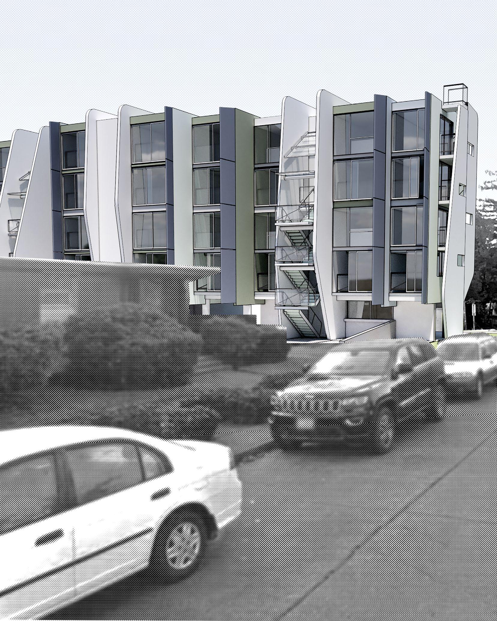 San Francisco and the Bay Area boasts a proud tradition of Modern architecture, the best examples of which were built in the sixties and seventies in the béton brut concrete system, by Paffard Keatinge-Clay, Luigi Nervi, Joseph Esherick, William Wurster, and others. In the present design this history is proudly recalled not only by the fact of its materiality but also by its form and massing, which exhibits the plasticity and dignified character particular to the material. Refusing to treat the concrete as merely a structural system to be covered up, the design instead emphasizes its unique, ever-changing surface quality, varying its handling from rough board-forming at its “rusticated” base to the smooth interior surfaces of steel formwork and plywoodformed exterior planes above. The honest durability of the material benefits both the owners and the community, ensuring a lasting sense of quality to the development, requiring little expensive or time-consuming maintenance, insulating neighbors from each other and the elements with effective sound control and environmentally friendly thermal mass.