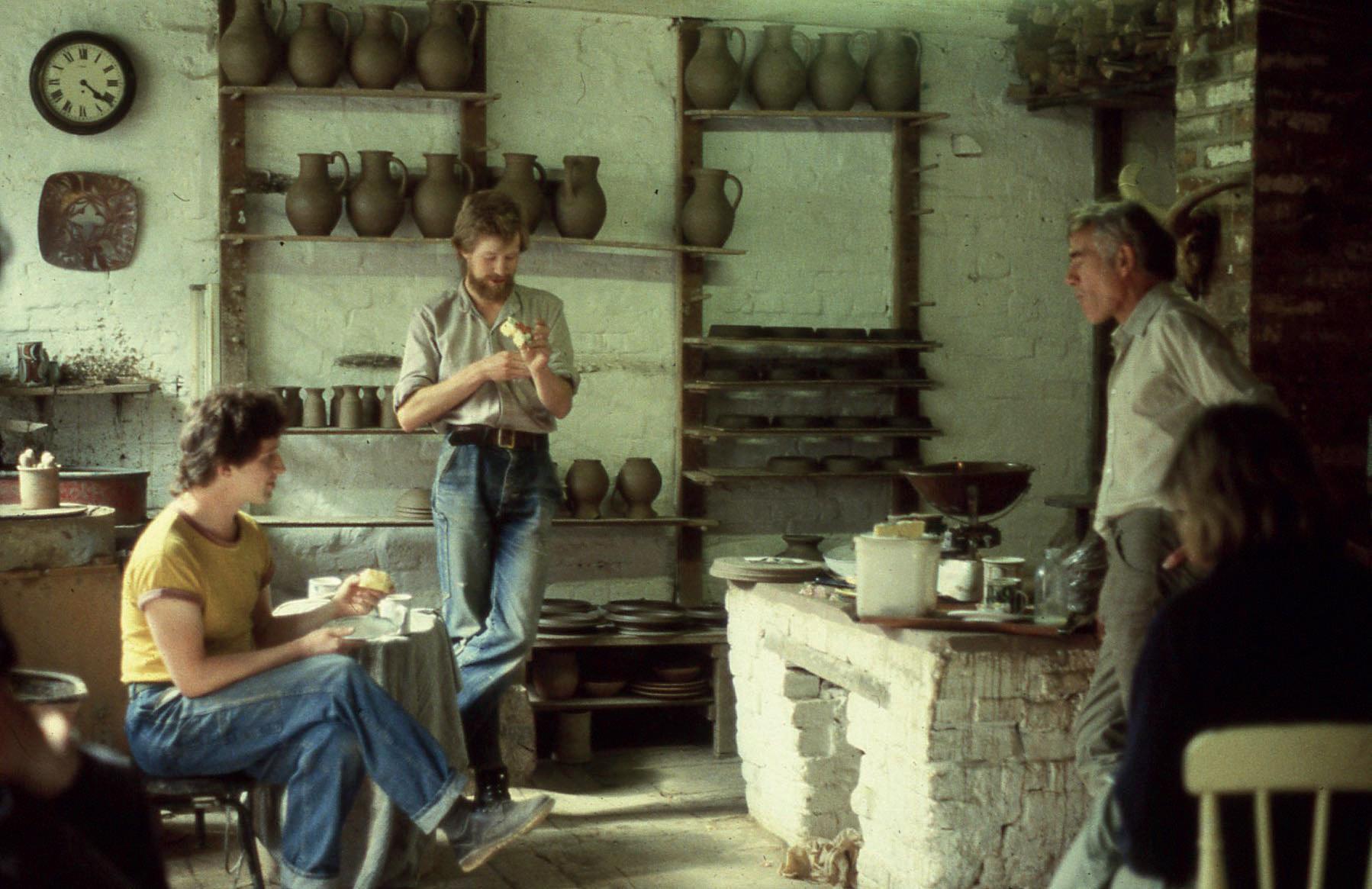 Real coffee was made in one of the coffee pots designed by Alan, and everyone drank from a mug made by one of the other potters. Pastries, sticky buns or lardy cakes from the village shop would be warmed on the stove-top and consumed as the potters sat and shared ideas and ideals. In the words of Catherine Bennett,