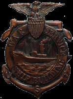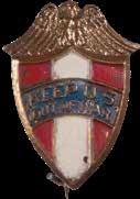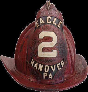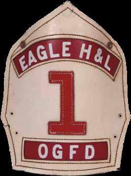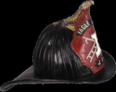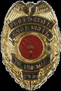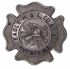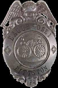 3 Eagle Hose 1 badge, Pittston, Pennsylvania, ca. 1900. 2¼ x 1½ inches. Metal. The Eagle Hose Company no. 1 originated as the Pittston Hose Company in the mid-1800s. The image on the badge is of a late-nineteenthcentury fire-hose carriage, which had large front and back wheels, a middle wheel for the wound-up fire hose, and lanterns on either end.