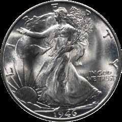 15 Walking Liberty silver half dollar, reverse, 1946, Adolph A. Weinman, designer. 13⁄16 inches diameter.