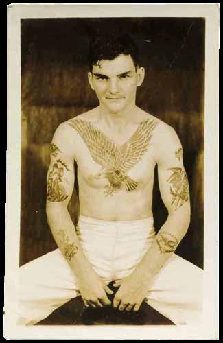 10 Photograph of tattooed man, photographer unknown, 1920s. 3½ x 5½ inches. A tattooed sailor with large flying eagle on his chest. On the upper part of his right arm is a smaller eagle with a snake, and on the upper part of his left arm another eagle. The tattoo on his left forearm identifies the USS Milwaukee as the ship on which he served.
