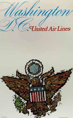 13 United Airlines poster, Jebary, artist, 1967. 40½ x 25 inches. An airline travel poster using the great seal as a symbol for Washington, DC.