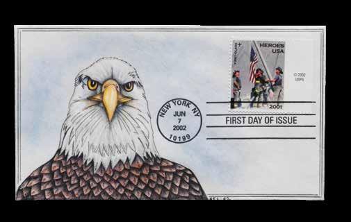 7 “Heroes USA” first day cover and cachet, June 7, 2002. The stamp commemorates emergency workers that provided aid during and after the September 11, 2001, terrorist attacks. The image on the stamp is Raising the Flag at Ground Zero, by photographer Thomas E. Franklin of the Record in Bergen County, New Jersey. The artist of the hand-drawn eagle is unknown.