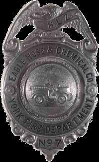 4 Eagle Hose & Chemical Co. York Fire Department No. 7 badge, York, Pennsylvania, C.G. Braxmar Co., New York, 1920s–30s. 2¾ x 1¾ inches.