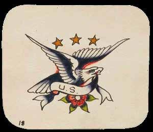 2–9 Tattoo flashes, Amund Dietzel, attributed artist. 1917–67. Watercolor and ink. 3⅞ x 3 to 5½ x 4¾ inches. Three of these flashes, or predesigned tattoos, have been positively identified as Amund Dietzel’s work: the one at top left (2), the “U.S.N.” eagle (6), and the shaking hands image (9). The others are likely also his, with the exception of the one directly above (11); see the caption for that one below. Dietzel was born in Norway and settled in Milwaukee, where he was known as a traditional tattoo artist. He rarely dated or signed his flashes, and rarely varied his style. Eagle designs were always in great demand.