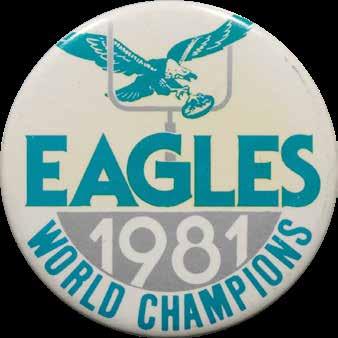 12 Philadelphia Eagles pinback button, World Champions, 1981. 3 inches diameter. Celluloid and metal. The Eagles lost the 1981 Superbowl to the Oakland Raiders, 27–10; this button was likely made in anticipation of an Eagles win and not officially circulated.