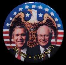 4 Bush-Cheney presidential-ticket campaign pinback button, 2000. 3 inches diameter. Celluloid and metal. The contentious 2000 presidential election was decided by the US Supreme Court in favor of Republicans George W. Bush and Dick Cheney, over Democrats Al Gore and John Kerry.