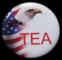 3 Tea Party pinback button, ca. 2010. 1⅜ inches diameter. Celluloid and metal.