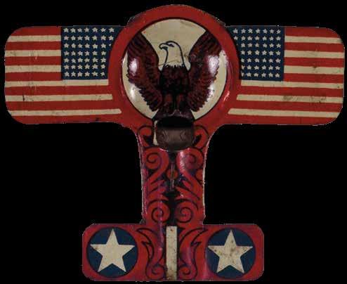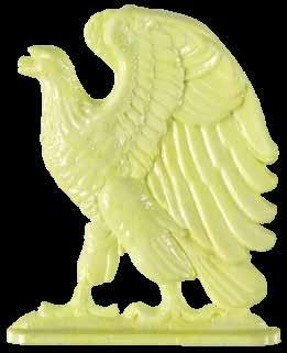 Some of the most beautiful and dramatic pieces in this book were produced during World Wars I and II, when gifted artists transformed the eagle’s natural characteristics into powerful images for wartime posters and medals. Soldiers serving in the trenches of World War I fashioned eagles on spent shells and other detritus, creating remarkable works now known as trench art. From WWII, the honorable discharge emblem, commonly called the ruptured duck, became so well known its image spilled over into civilian culture, appearing on bookends and license-plate toppers.
