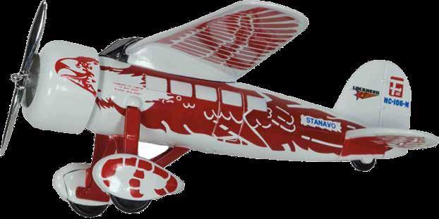 14 Stanavo Eagle Vega airplane bank, Liberty Classics, SpecCast, Dyersville, Iowa, 1992. 10⅞ x 7½ x 3 inches. Enameled die-cast metal. In the 1930s, when airplanes were a new and exciting form of travel and entertainment, companies decorated corporate planes for publicity purposes. The toy bank is modeled on the 1930 Lockheed Vega, called the Stanavo Eagle, owned by Standard Oil of New Jersey. The word vega derives from Arabic and translates as “descending eagle.”