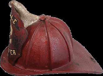 8 Eagle 2 “high eagle” fire helmet, Eagle Steam Fire Engine Co., Hanover, Pennsylvania, early 1900s. 9 x 10 x 14½ inches. Red leather. Side (above) and front (below) views of the helmet.