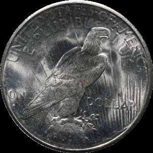 14 Peace dollar, reverse, 1928, Anthony de Francisci, designer. 1½ inches diameter. Silver. San Francisco mintmark. The Peace dollar was issued to commemorate the end of World War I. A profile bust of Lady Liberty is on the coin’s obverse.