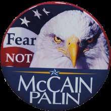 5 McCain-Palin presidential-ticket campaign pinback button, 2008. 3⅜ inches diameter. Celluloid and metal. Sarah Palin was the Republican Party’s first woman vice-presidential candidate.