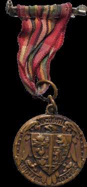 1 “Do Right and Fear No Man” medal, Theodore Spicer-Simson, artist, 1917. 3¼ x 1 inches. Bronze and ribbon. A medal issued by the American Fund for the French Wounded, a relief organization for WWI soldiers founded by American women living abroad. Spicer-Simson, a respected portrait medalist, designed the obverse before the US entered the war. The shield carries Allied symbols: the ship for Great Britain, cock for France, cross for Italy, and lion for Belgium. The motto is from one of George Washington’s dress swords.