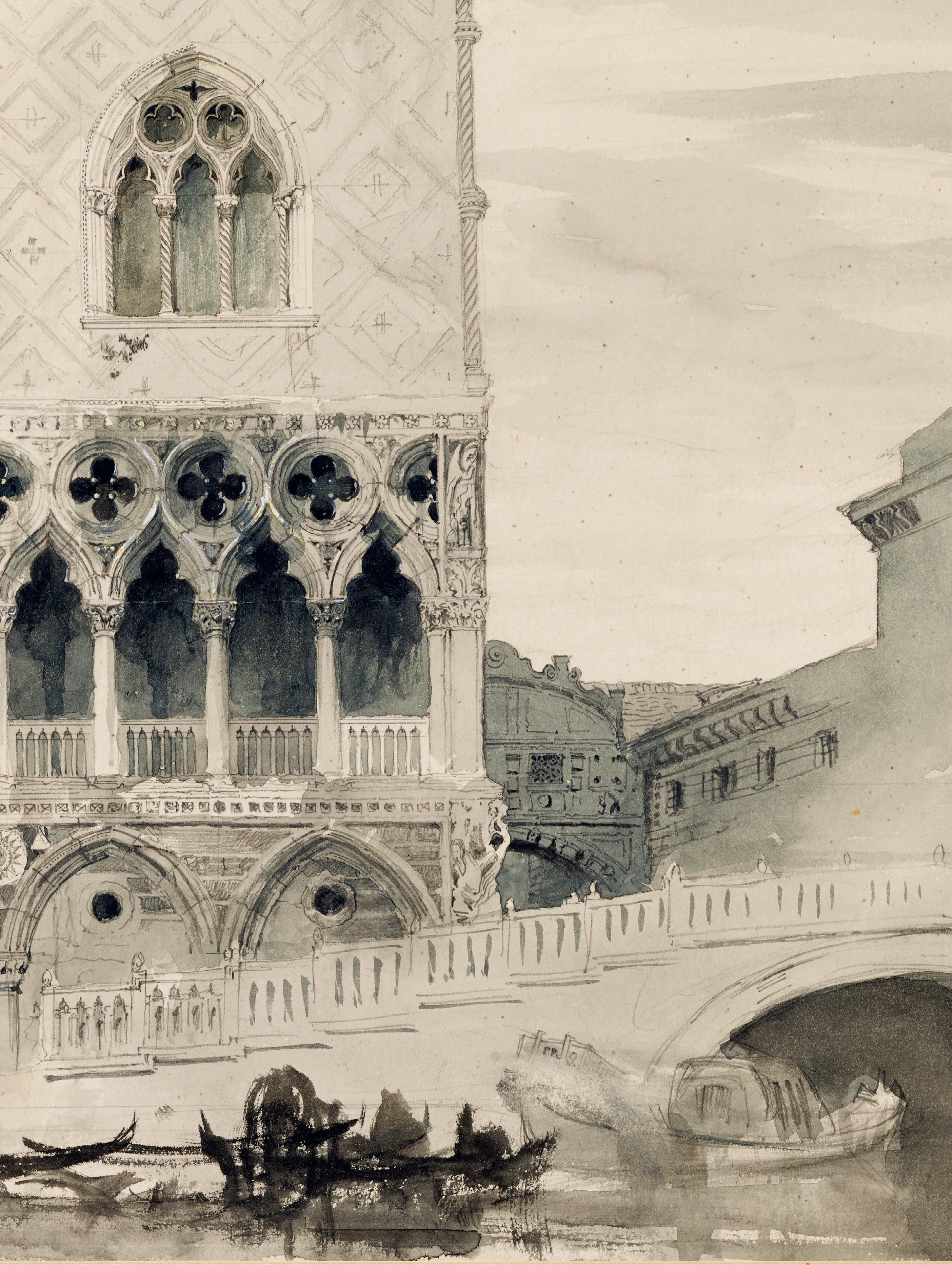 Having spent only a week in Venice on their first visit in 1835, Ruskin and his parents enjoyed a longer stay in 1846. The family arrived on 14 May and were to remain until the 28th, travelling to Padua at the start of their return journey. This sparkling watercolour, which Ruskin later called ‘the most beautiful example of Byzantine colour I could give’,53 was made on the day before their departure. There are almost a dozen large architectural drawings from the 1846 tour, featuring sites in Geneva, Verona, Bologna, Florence and Lucca, as well as this sole Venetian subject. They provided a template for the larger individual studies of buildings in Venice made in 1849–50 and now known as ‘worksheets’.