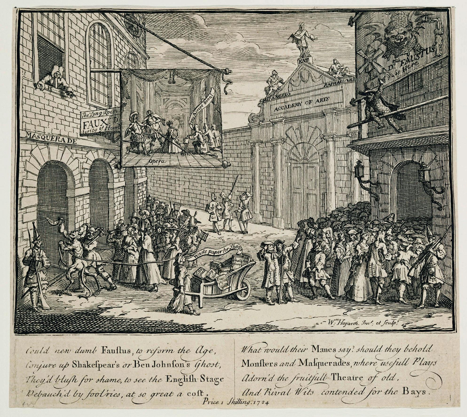 Opposite: The Taste of the Town, 1724. The banner shows a group of English noblemen entreating an Italian singer to perform in London; she rakes in their money. Crowds go to masquerades and commedia dell’ arte while a waste paper hawker trundles a barrow full of the works of Shakespeare, Dryden and others. In the background three virtuosi admire Lord Burlington’s Italianate gateway, labelled ‘Accademy of Arts’