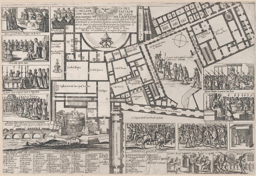 Ceremonies after the death of Alexander VII, 1667. Prayers are said, the people kiss the feet of the late pontiff, and the cardinals process from Saint Peter’s to the conclave. Salutes are fired from Castel Sant’Angelo