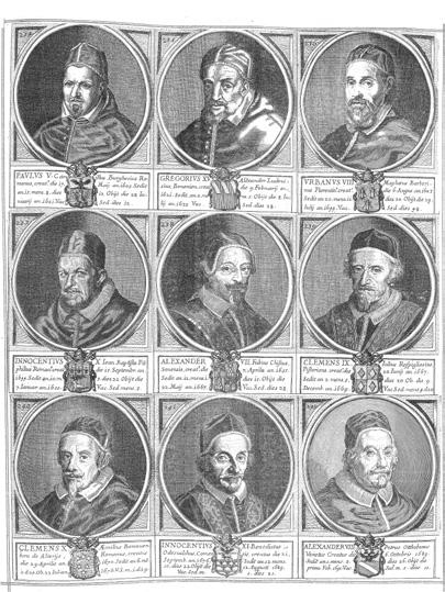 The popes during Bernini’s working life. Left to right from the top: Paul V, Gregory XV, Urban VIII, Innocent X, Alexander VII, Clement IX, Clement X, Innocent XI. The last one, Alexander VIII, was a close friend, but only elected after Bernini’s death