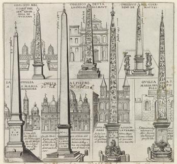 Not until the end of the sixteenth century was the custom of raising obelisks revived. Beginning in 1584, the uncouth and violent Pope Sixtus V re-erected four, using them as exclamation points in the Roman cityscape. They defined a network of roads linking the Piazza del Popolo—the traditional grand entrance to Rome—with Saint Peter’s and the great basilicas of Saint John Lateran and Santa Maria Maggiore, imposing a new order on Rome and making it easier for pilgrims and other visitors to navigate the city. These obelisks had massive propaganda value as well. Transformed into Christian monuments, they embodied the triumph of the Church over the pagan Roman Empire and, in the face of the trauma of the Reformation and the rise of Protestantism, proclaimed that Rome was still in business as the Holy City.