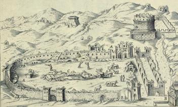 Overleaf: Rome as reorganized by Sixtus V. A star-like grid of roads connects the main churches of Rome, most clearly Santa Maria del Popolo (bottom left) to the Lateran (top right), passing Santa Maria Maggiore in the centre of the picture, all of them signposted by obelisks. The inscription reads: ‘When he opened the direct paths to the holiest churches, Sixtus himself opened the way to the stars’