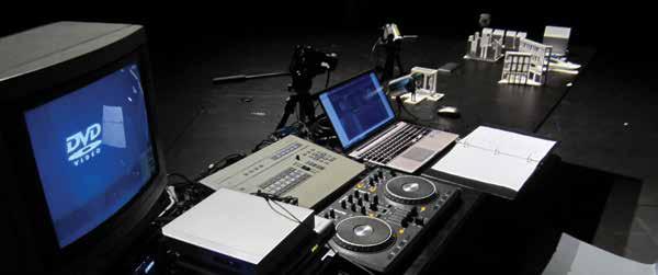 This page and next page: Interlude with behind the scenes photos of live model setup. In reading order: (1) live video feed with 3D printed model; (2) close-up of The Stage; (3) the author setting up video mixing equipment; (4) live mixing setup; (5) live mixing in action; (6–9) close-ups of The House, The Street Corner, The Classroom, and The Market; and (10) audience viewing of the live model in action. Source: author.