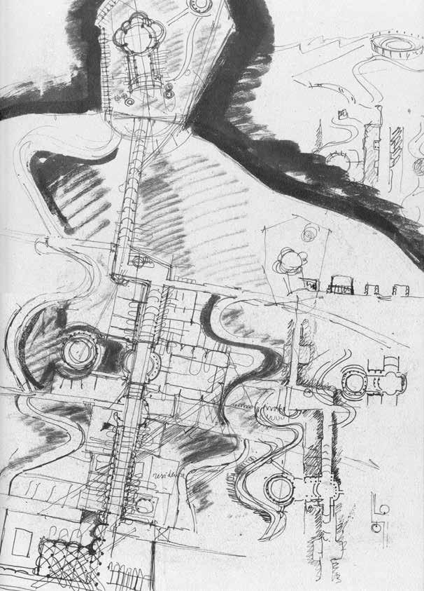 component and he wrote the words: “Here one either practices Agàpe or one dies” on the back of a photograph of the construction site. For Ricci, barely twenty-eight years old at the time, Agàpe was a ray of light and of hope in a world devastated by war; a place for creating a different vision of humanity and a symbol of integration.58 He responded to his first important creative task by reducing the number of his plans and drawings to a bare minimum and actively participating in the work on the construction site. He now expressed his ideas in rather naïve simple sketches.59 Michelucci’s message can be discerned in this approach, with its mistrust in rigid plans or designs that can be restrictive or detrimental to real living requirements, which are constantly changing and evolving. Working directly on the building site clearly represents an attempt to adapt to the needs of the future inhabitants. Ricci thus engaged in endless experimentation, during which he began to discover and express his own radically new approach to architecture, so much so that the construction process of the community was reported in many foreign magazines.60 Construction methods were empirical and artisanal, favoring the use of local materials. The stones were chosen, cut, and brought to the site by its future inhabitants, their colleagues, and their friends in a spontaneous and