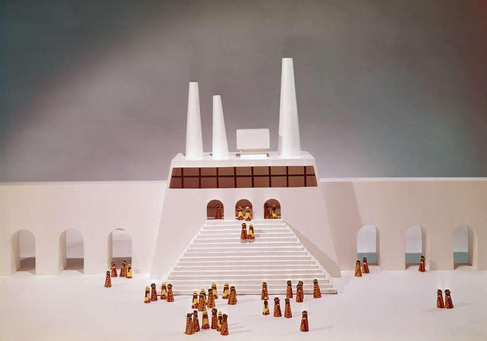 The Punt e Mes poster was a landmark in Italian graphic design and advertising but it was part of a series of work that Testa did in 1960 that involved painting and sculpture as well as screen-printing. The sphere and a half was explored as an image on canvas, first painted with loose, expressive but economical brushstrokes in red and black, and then in two tighter acrylic paintings, one in red, the other in black, that are closer in feel to the poster but still with painterly traces. The black version has the vapourised halo of his Facis posters, if slightly less pronounced, and his allusion to the importance of Seurat in his work made back in the fifties seems resonant here. More profound, at least to my eyes, is his pre-figuring of Minimalism. Pop Art was firmly established by 1960, and Testa’s training as an abstract painter was frequently apparent across his creative output, but references to the emerging late Modernist Minimalist movement have yet to be fully acknowledged and without overstating the case, Testa seems to be well in the vanguard. The red fibreglass sculpture, also made in 1960, only amplifies this, but also brings into sharper relief Testa’s enduring obsession across his polymorphic practice: that of synthesis.