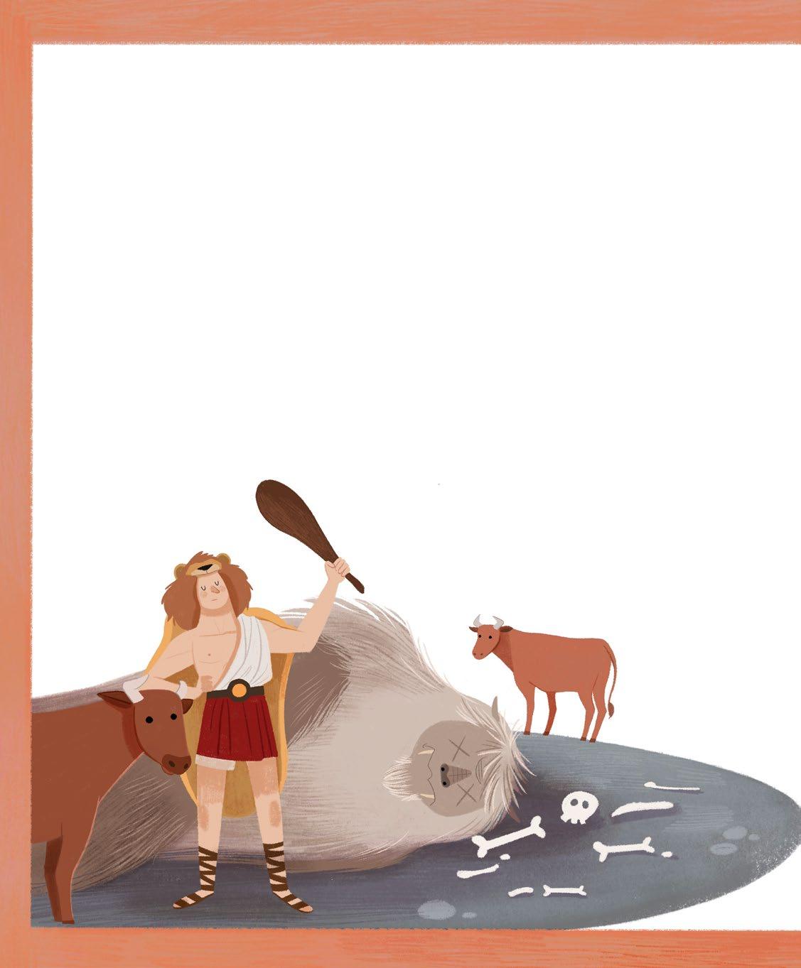 It’s said that somewhere on the Aventine Hill, there was a cave inhabited by the terrible giant CACUS, a fire-breathing creature with yellow teeth, whose body was covered with hair. One day, HERCULES, the demigod with extraordinary strength, arrived in Rome with a herd of beautiful red cows he’d stolen from the giant GERYON. Tired, he fell asleep near the Tiber, but upon his awakening he discovered that some of the cows had disappeared. CACUS HAD STOLEN THEM. Hercules went into the giant’s stinking cave covered with bones, and killed him with his club.