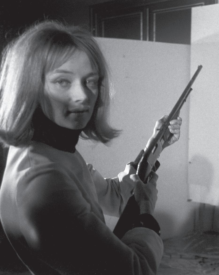 and shot at them with a rifle, wearing, it has to be said, a very glamorous body-hugging pure white suit, which attracted huge media interest. Her fabulous style had a serious intent.