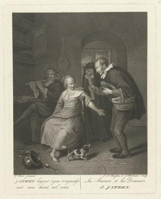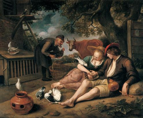 Steen was approximately 45 years old when he painted this amusing scene. He had returned to his native Leiden for good in 1670. Steen was a widow at that point; he would remarry in 1673, when Maria van Egmond became his second wife (see cat. 25). It is tempting to think that his unmarried status at the time may have played a role in this warning against the foolishness that men can fall prey to when possessed by lust.