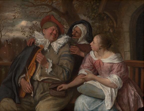 Jan Steen was a born storyteller who was not afraid to poke fun at himself. In this loosely rendered work, he presents himself in the role of the lusty chap, willingly allowing a beautiful young woman to rob him. The old woman in between them offers him a glass of wine, though it is not really necessary. Even without the influence of alcohol, this merry violin player would be easily seduced. Steen deployed his entire arsenal of gestures, emotions, costumes and symbolism to enhance the comedy of an already comic situation. For instance, the violinist wears an old-fashioned sixteenth-century suit, while the raised pipe – hardly subtle – refers to his state of arousal. The violin also serves as a sexual symbol. The seventeenth-century verb ‘vedelen’, meaning to fiddle, was also used to refer to sexual intercourse. The woman, on the other hand, appears at first glance to be the image of respectability. No low neckline or excessive embellishment, but a modest dress and, on her lap, a cushion she uses for her embroidery. As she talks to the man – gesturingwith one of her hands – she dexterously slips her other hand into his purse.