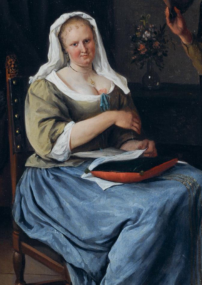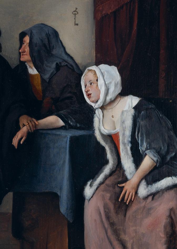 particularly eye-catching, thanks to the masterful rendering of the fabrics. The chair with the lion’s head and the bouquet in the background are also meticulously executed. Such love scenes were particularly popular with the fijnschilders, who could flaunt all their skills when painting fabrics and lavish interiors. Steen also used his most refined brushwork to depict wealthy figures.