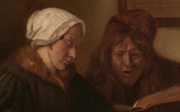 This small panel depicts a pious couple sitting close together, reading the Bible. The man’s open mouth suggests that he is reading aloud, as his wife sits with her eyes downcast, listening to the edifying words. Everything suggests that these people lead a modest, devout life. The woman’s clothes also make it clear that they are not impecunious. She is wearing a warm fur collar, and the end of her silver ear ornament protrudes from under her lace-trimmed bonnet. The cosy atmosphere is enhanced by the brazier on her lap, with glowing embers in an earthenware basin that give off a pleasant warmth. Braziers of this kind often feature in seventeenth-century paintings, usually placed on the floor to warm the feet. Sometimes, as here, the brazier is on a person’s lap – a nice choice for this intimate composition, drawing our attention to the woman’s subtly folded hands.