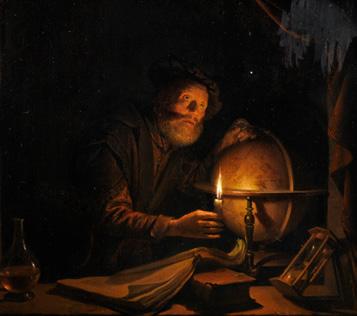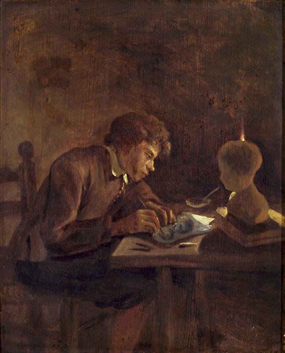 On this very small panel, Jan Steen painted a young man drawing a plaster bust by flickering candlelight. The candle is positioned in such a way that only the flame is visible, above the bust, which produces a somewhat disconcerting effect. The warm glow highlights the boy’s concentrated expression and his fingers. The rest of the room is shrouded in darkness, Steen rendering the empty background with rapid brushwork, so that nothing distracts us from the young draughtsman. This was clearly inspired by the work of Gerrit Dou, who specialised in scenes lit by candlelight (fig. 5a).