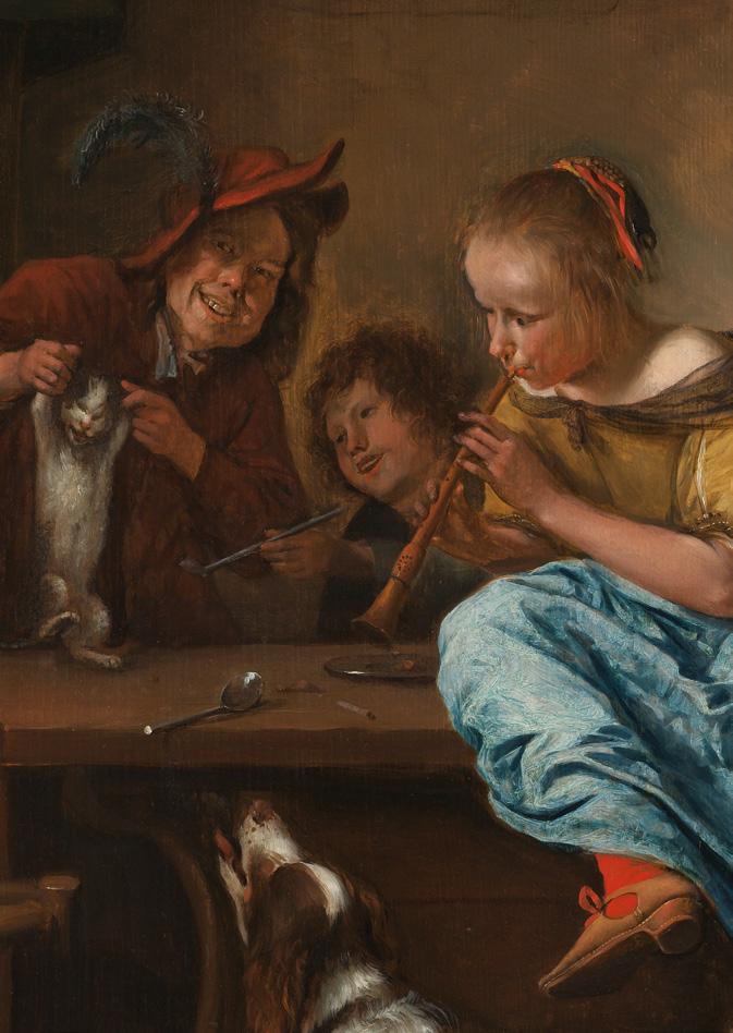 We do not know what or who prompted Jan Steen to take up a paintbrush. But shortly after he enrolled with the guild, he went to work in the Hague workshop of landscape painter Jan van Goyen – and promptly fell in love with Van Goyen’s daughter Margaretha (Grietje). Fortunately, they were both Catholic, and so were able to marry in 1649. Shortly after their wedding, Steen painted himself and Grietje in Couple Reading the Bible (fig. 5, cat. 3). He would habitually depict himself and his loved ones in his paintings throughout his life. Jan and Grietje had seven children who reached adulthood: Thaddeus, Eva, Constantinus, Havick, Johannes, Catharina and Cornelis. We know the faces of the Steen children – it is highly likely that their father used them as models in paintings like The Feast of St. Nicholas and Children Teaching a Cat to Dance (fig. 6 and 7, cat. 17 and 23).