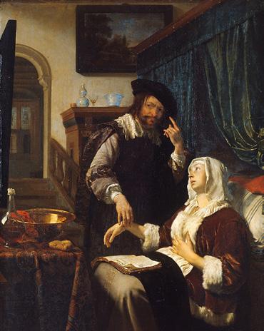 Steen started painting scenes of doctors’ visits in around 1660, during the time when he and his family lived in Haarlem. But his inspiration for this popular subject came more from the work of artists working in Leiden, particularly the finely executed paintings of Frans van Mieris (fig. 14a). The foolish doctor, the limp wrist, the bottle of urine and the inviting four-poster bed also featured in his repertoire.