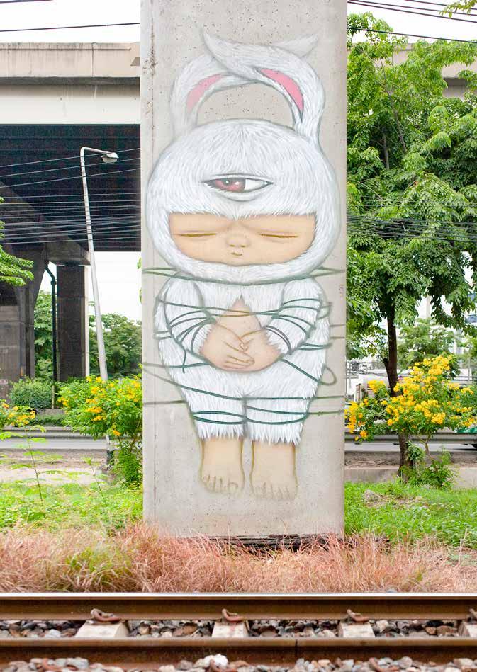 The just-completed nocturnal journey over Bangkok’s highways still tunnels out of the back of my closed eyelids. I step off the motorbike into tungsten light – glad to walk a bit. A year before, in 2013, I’d first glimpsed this place while driving with a friend out through the back lots behind Klong Prem Prison. We passed across railway tracks within a forest of tall cement columns and, momentarily aligning with their very centre, I’d looked down the line. Within a heartbeat, the hundreds of columns and their overhead beams – illuminated with a fanciful menagerie of saints and monsters – created a tunnel of ever-diminishing frames surrounding a slender pyramid formed by the tracks merging on the horizon – Hopewell (see opposite).