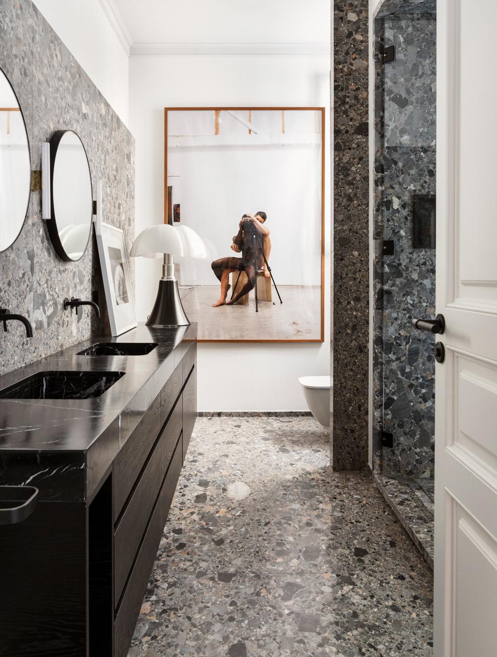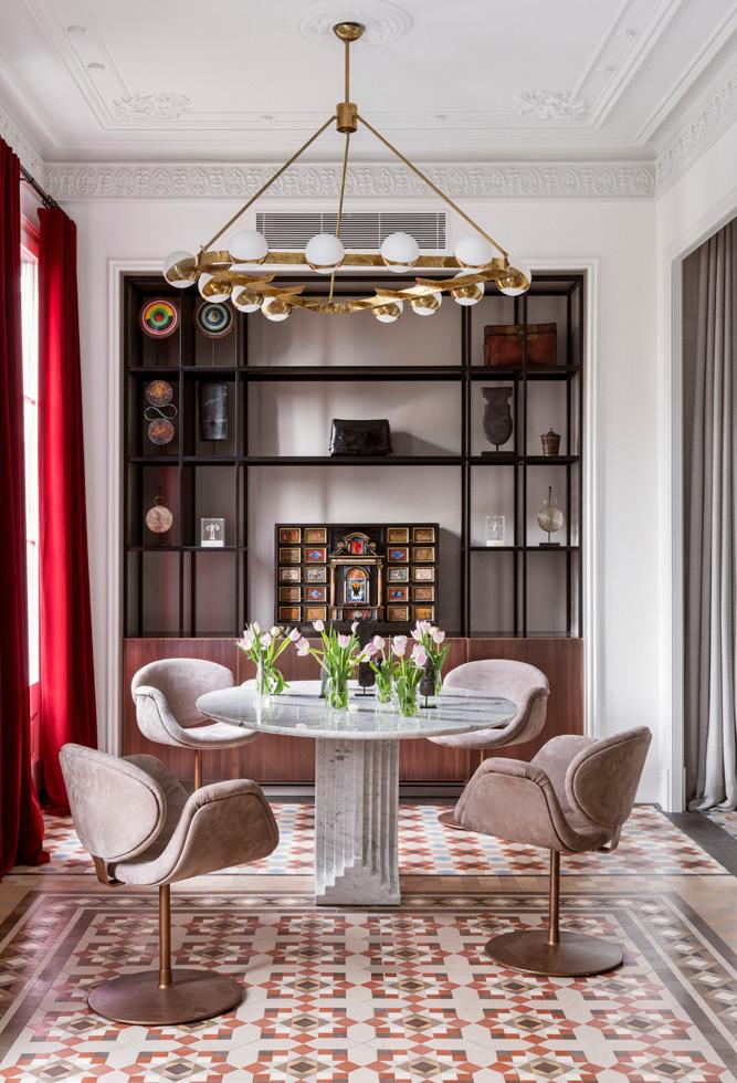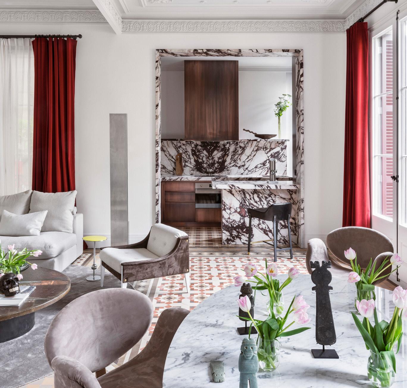 de cemento para instalar debajo la calefacción y otros elementos de ingeniería. En las partes nuevas, como el baño, donde teníamos mayor libertad, opté por usar suelos y materiales más contemporáneos. El objetivo era diseñar una vivienda vanguardista pero cómoda, para clientes estadounidenses con una perspectiva muy diferente a la de los europeos. Se trataba, básicamente, de entender sus gustos y hábitos americanos y poder adaptarlos para crear su pied-à-terre en Barcelona. Y lo cierto es que me encantó lograr esa consistencia, mezclando muebles mid-century y arte contemporáneo, que adoran mis clientes”.