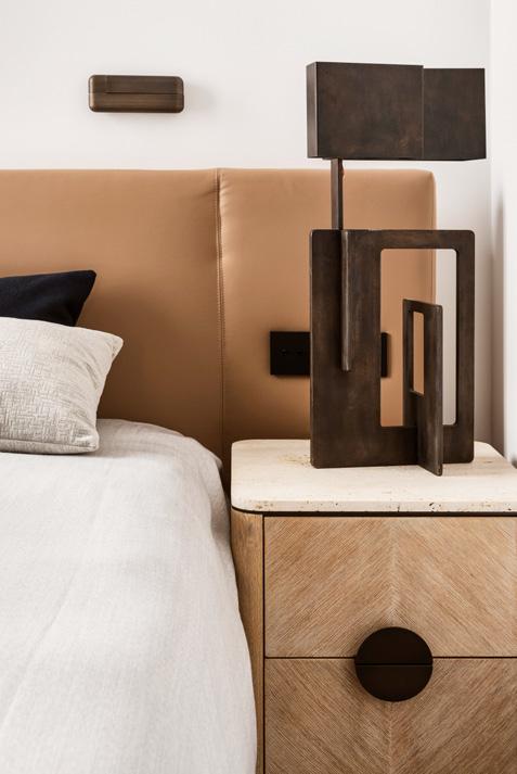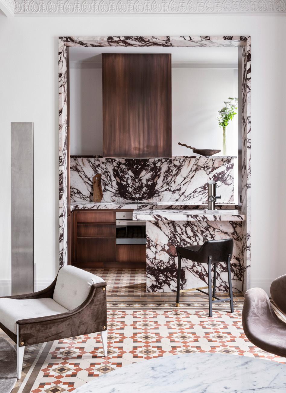 de los techos. La cocina se diseñó con el uso de paramentos de placa de cobre patinado y sobres de trabajo de mármol de Calacatta Viola de Germans Serra. Otro material natural, en este caso la piedra Breccia, protagoniza el baño principal, donde la ducha se convierte en caja y eje pivotante del mismo material y une vestidor con el resto del baño.