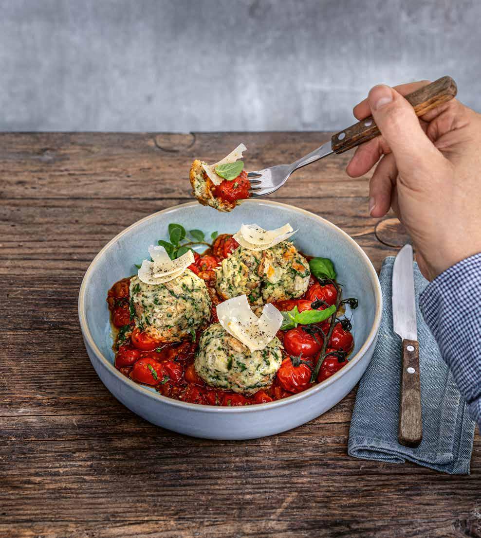 4 Combine the toasted and untoasted bread cubes, spinach, eggs, breadcrumbs, quark, flour, and the milk and onion mix in a bowl, mix thoroughly. Wet your hands and shape it into dumplings. Cook in boiling salted water. Remove the spinach dumplings, drain, arrange on top of the cherry tomato sugo and garnish with basil pesto and basil as desired. Serve and enjoy!
