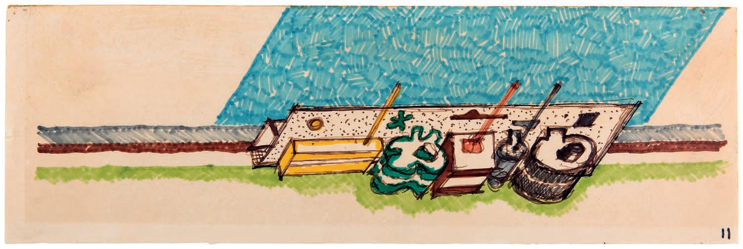 John Hejduk, axonometric of elements, Wall House, 1972. Black and coloured felt-tip pen on paper, 85 × 273 mm (DMC)