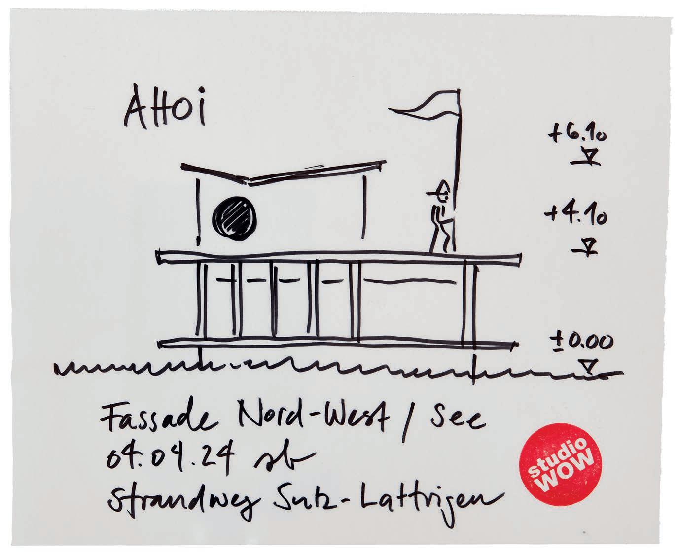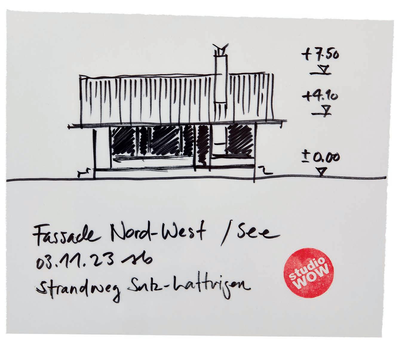 studio WOW, north-west sea facade, beach walk Sutz-Lattringen, 2023. Felt-tip pen on tracing paper, ca. 225 × 260 mm