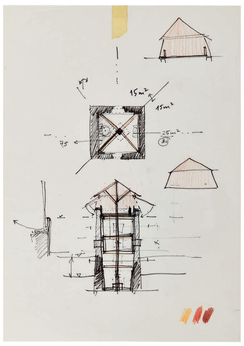 Barão Hutter, sketch plan and section, Weiler Güpsen, conversion and extension of a medieval watchtower, St. Gallen, 2014. Felt-tip pen and coloured pencil on tracing paper, 420 × 297 mm