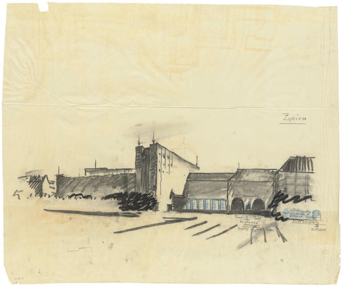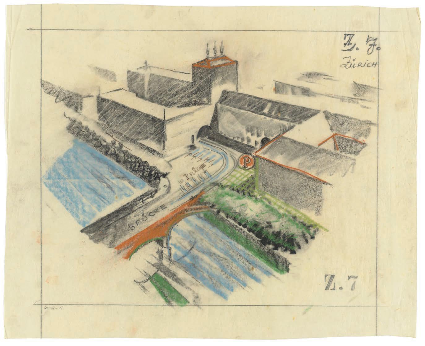 William Dunkel, bird’s-eye view of riverfront of the Stampfenbach development, Walche cantonal administration buildings, Zurich, 1927. Pencil, charcoal, and pastel on tracing paper, 435 × 540 mm (gta Archiv)