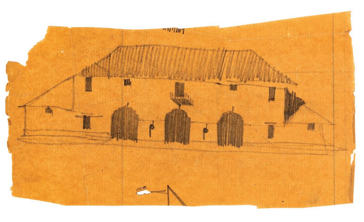 Edwin Lutyens, facade of outbuilding, possibly the palace of El Guadalperal, Cáceres, 1915–1934. Pencil on thin brown paper, 125 × 220 mm (DMC)
