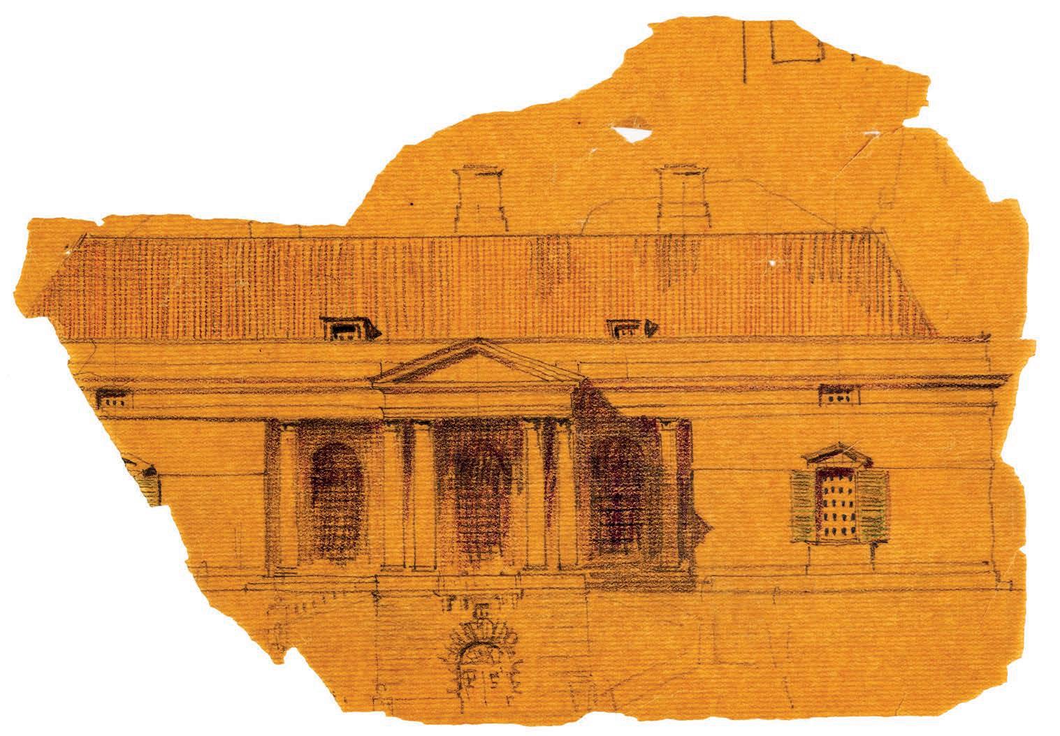 Edwin Lutyens, facade, possibly the palace of El Guadalperal, Cáceres, 1915–1934. Pencil and coloured crayons on thin brown paper, 150 × 215 mm (DMC)