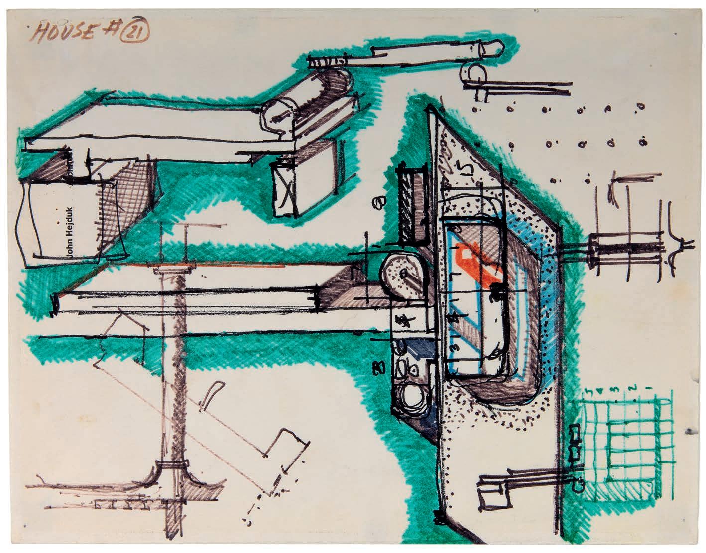 John Hejduk, axonometric, Bye House, Connecticut, ca. 1973. Black, green, blue, and red ink on letter-headed paper with printed title ‘John Hejduk’, 210 × 270mm (DMC)